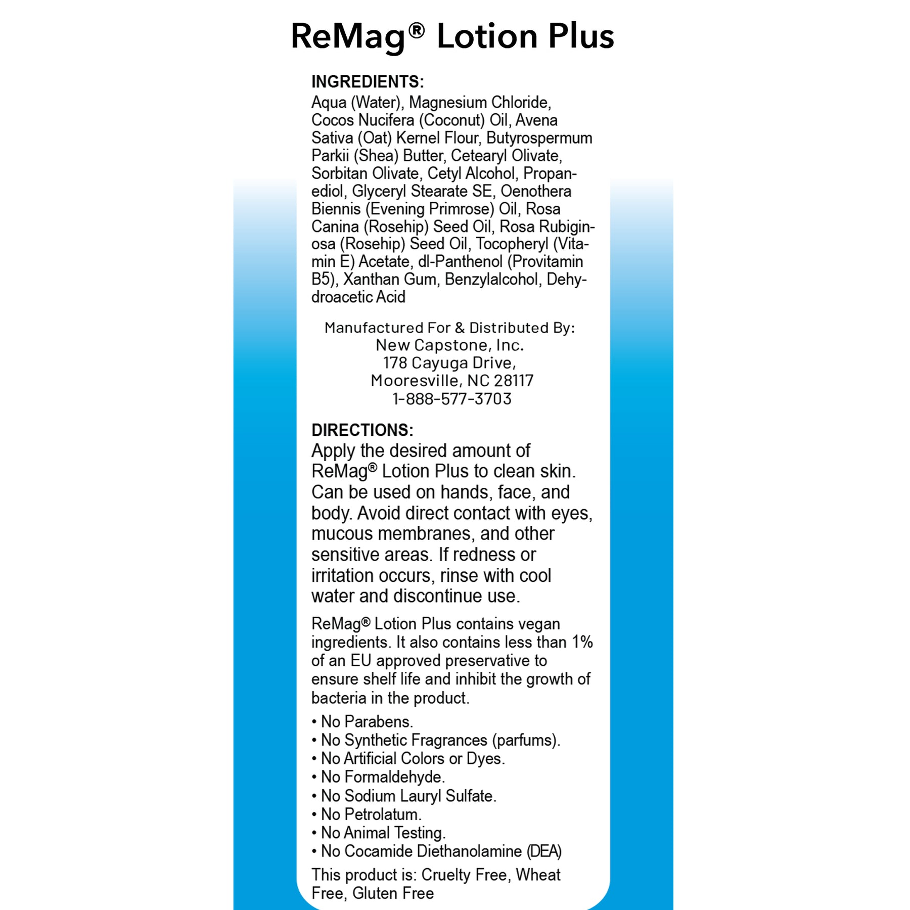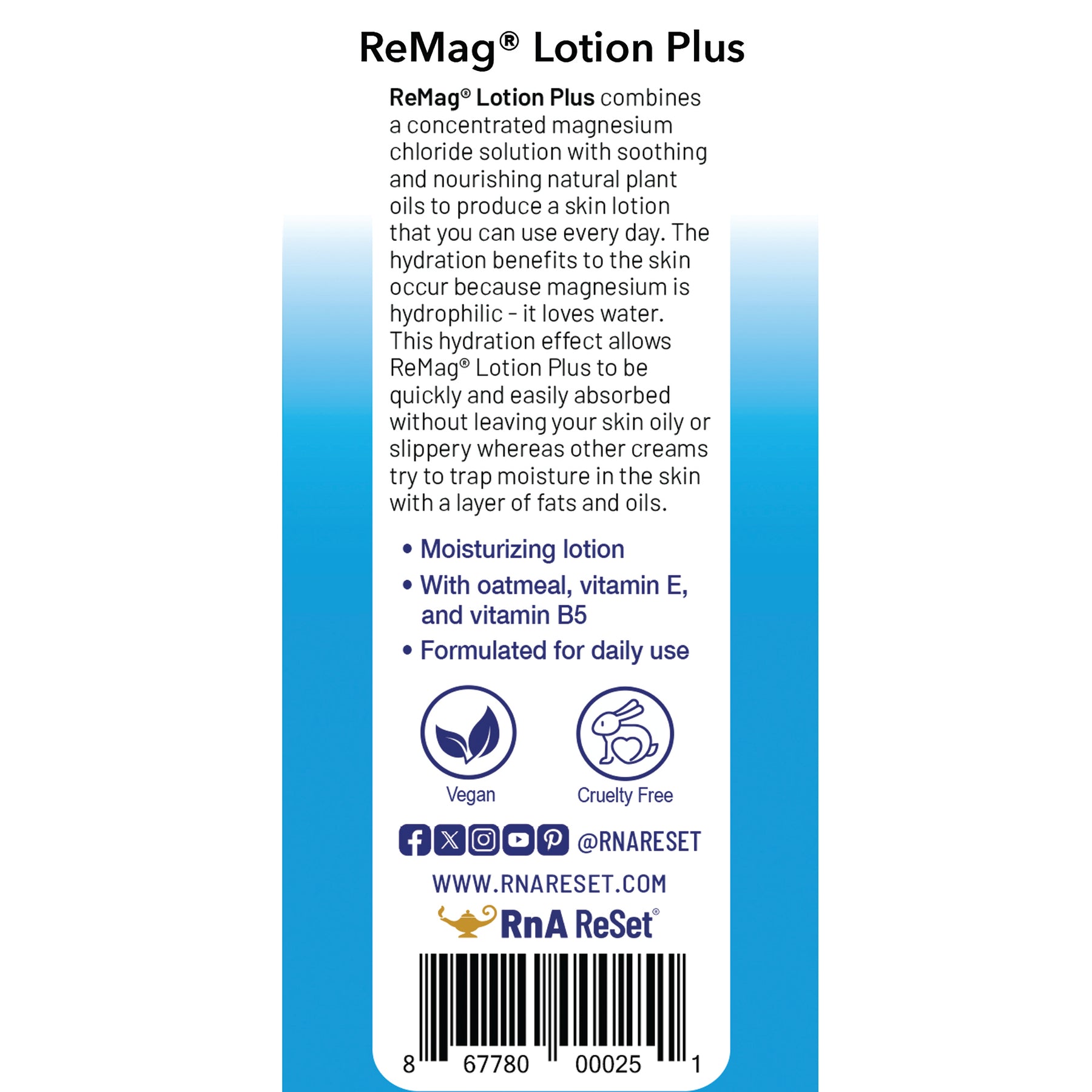 - ReMag Lotion Plus is a hydrating moisturizing lotion blended with ReMag Magnesium for hydration, oatmeal to soothe, and vitamin E and vitamin B5 to protect.